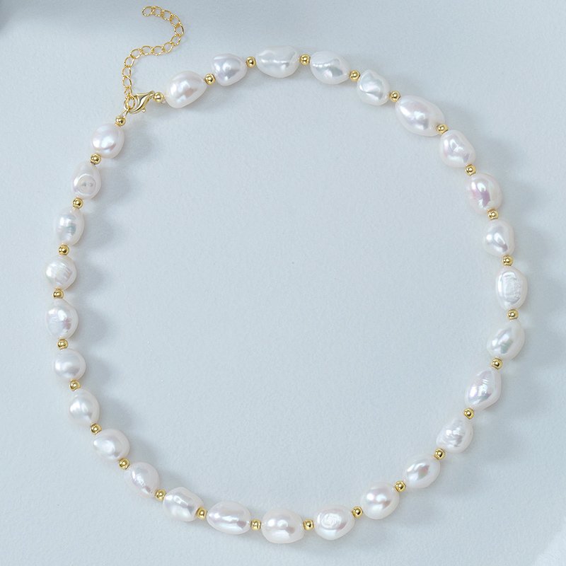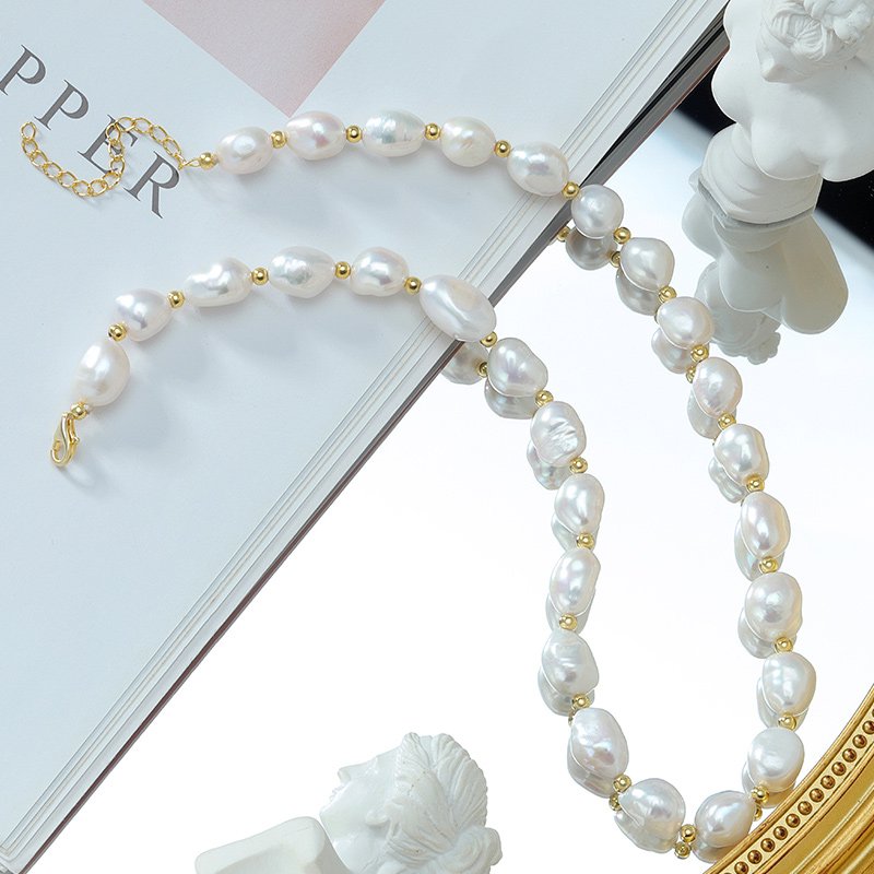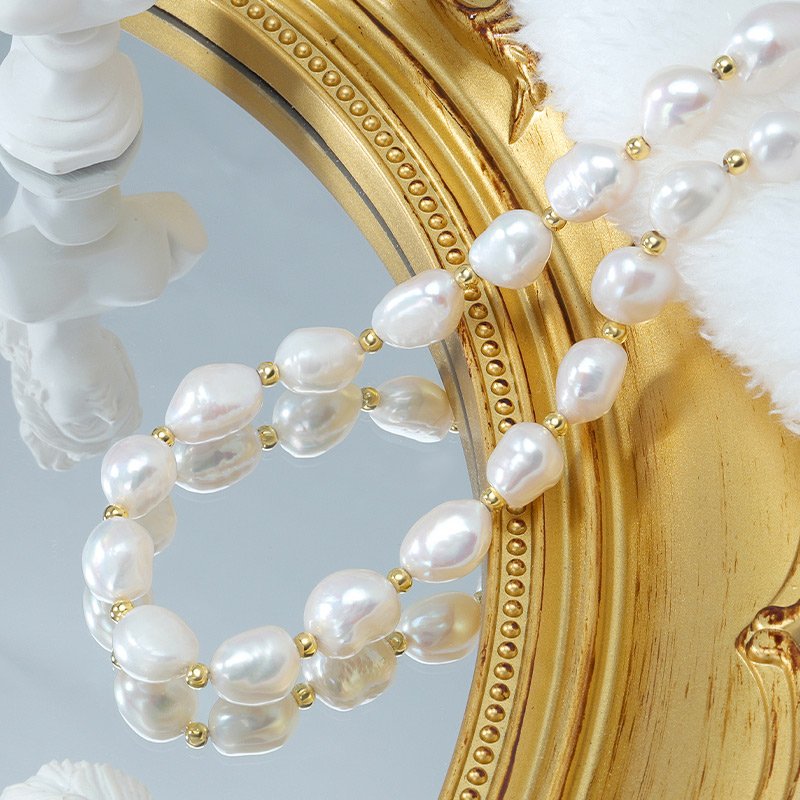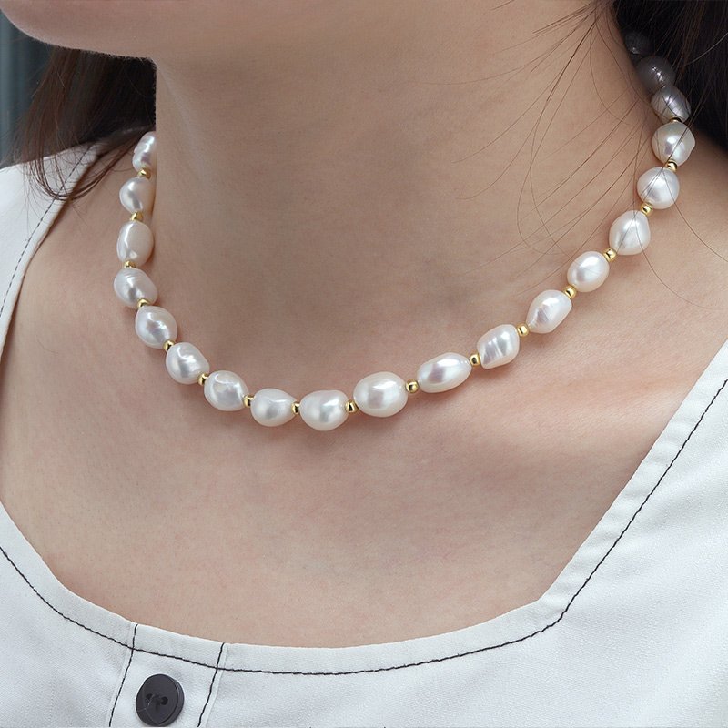 A refined choker necklace crafted in 925 sterling silver with 18K gold plating, featuring naturally shaped baroque pearls. Each pearl offers organic character and subtle luster, creating a timeless statement that balances elegance with modern sophistication.
