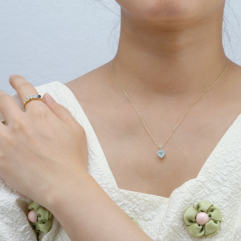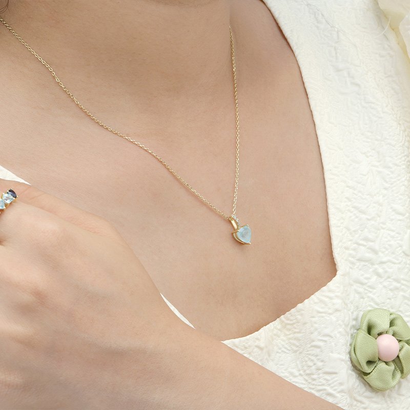 A refined pendant necklace featuring a heart-shaped aquamarine centerpiece, designed to reflect clarity, serenity, and timeless elegance. Its soft blue tone and balanced proportions make it an ideal everyday luxury piece or a meaningful gift with lasting appeal.