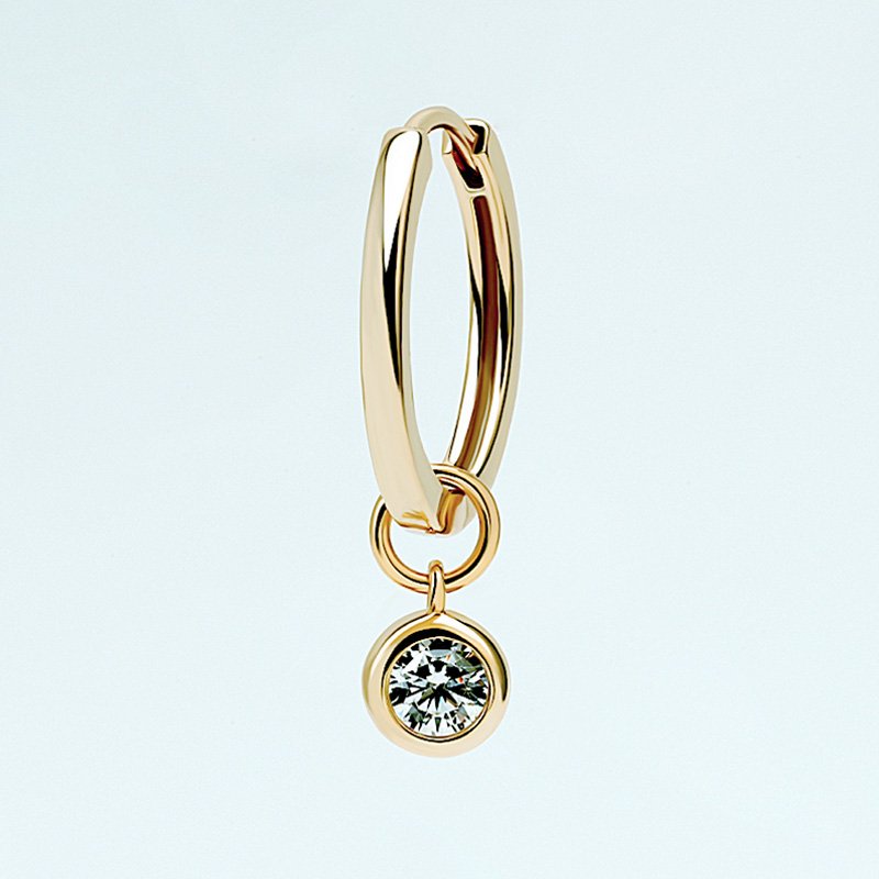 The Bezel Zircon Charm Hoop features a refined hoop silhouette accented with a bezel-set zircon charm. Clean lines, balanced proportions, and a polished finish create a timeless design intended for effortless, everyday wear. The suspended charm adds subtle movement while maintaining a composed, minimalist profile.
