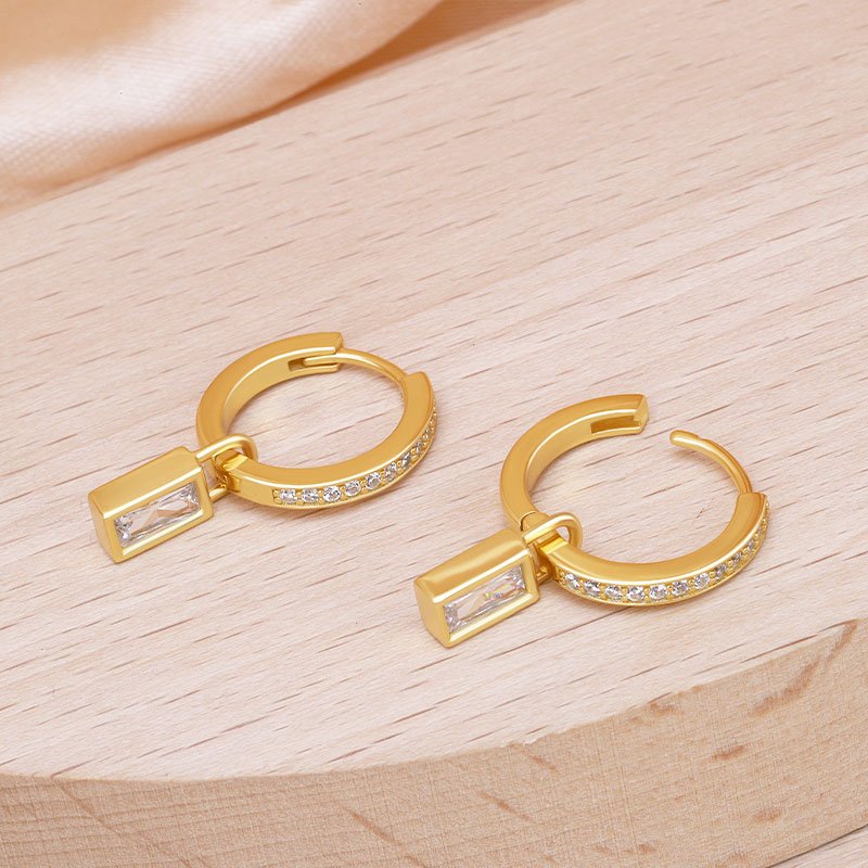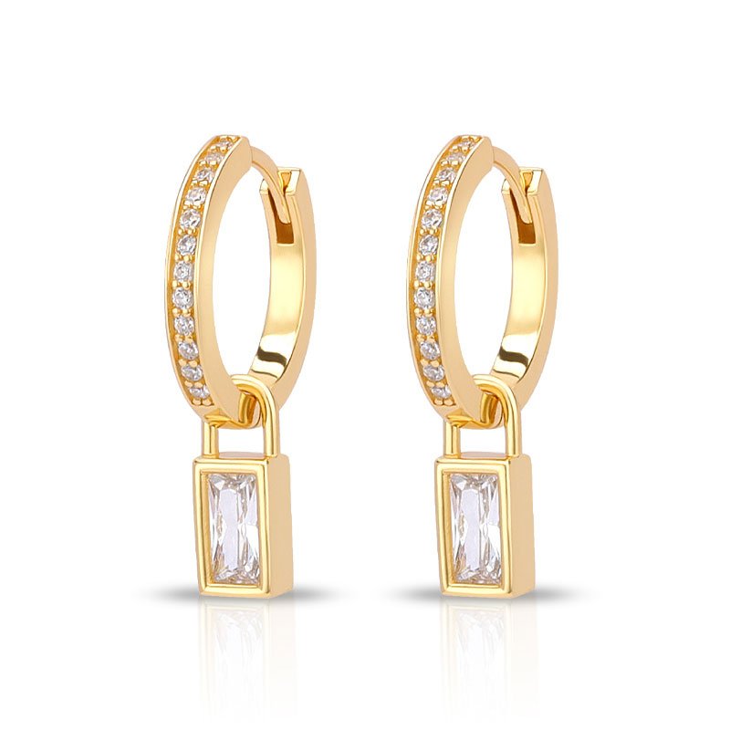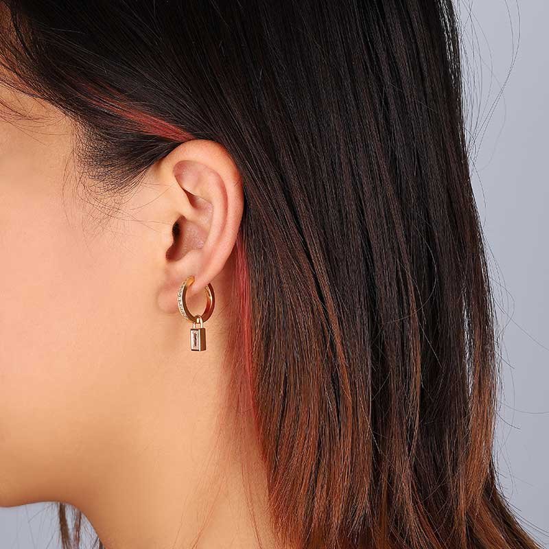 Refined geometry meets subtle brilliance in the CZ Hoop Earrings with Baguette Charm. Designed with a compact huggie silhouette, this piece pairs a clean rectangular baguette charm with a precisely set row of cubic zirconia, delivering a modern balance of structure and sparkle.
