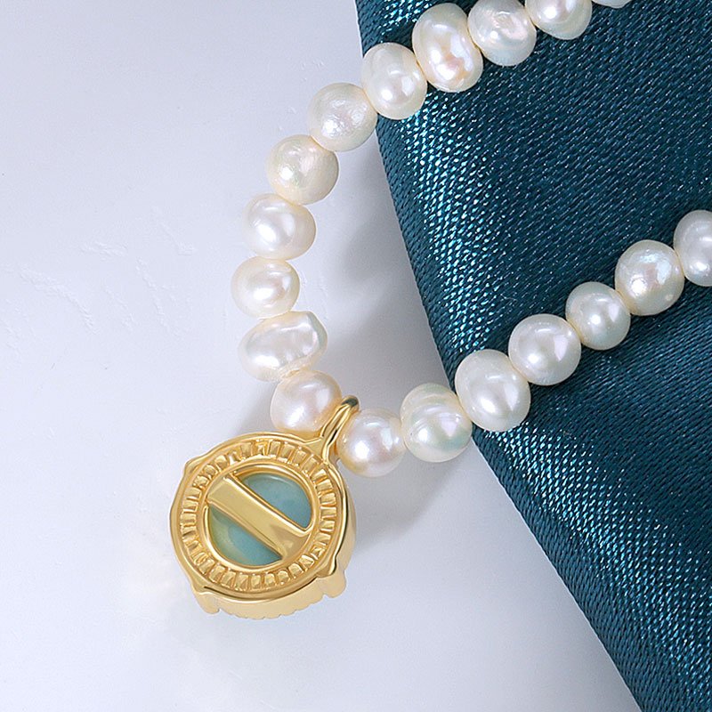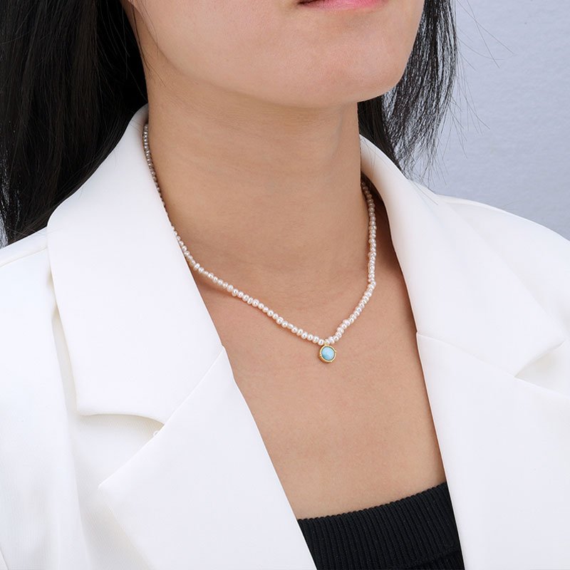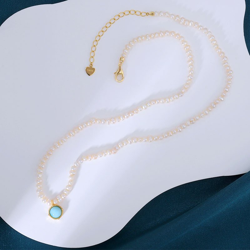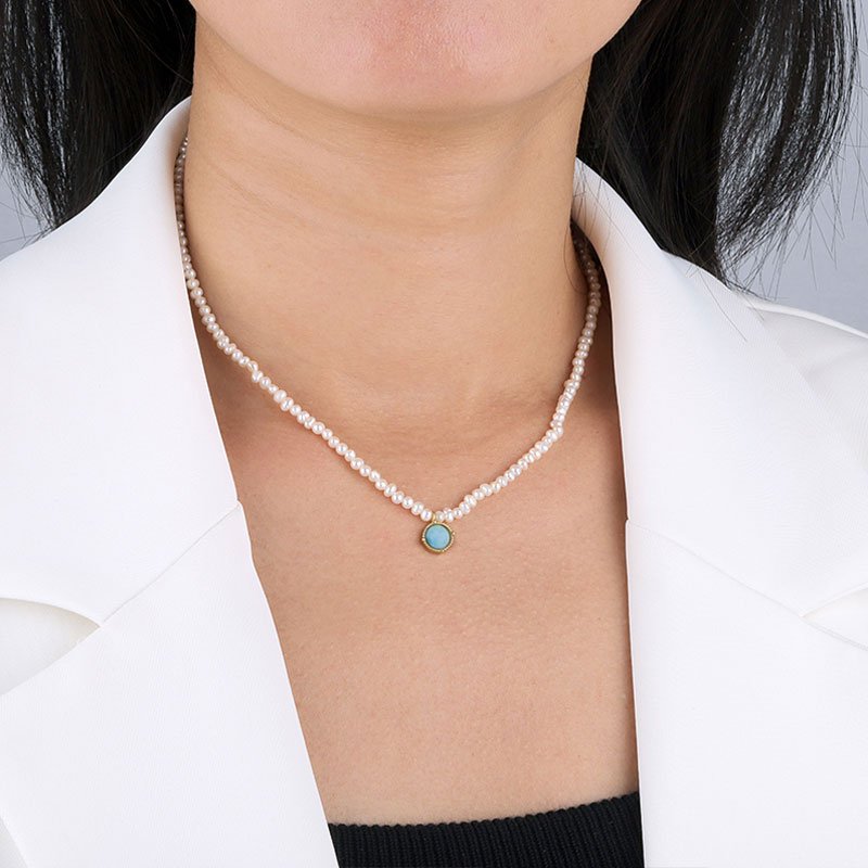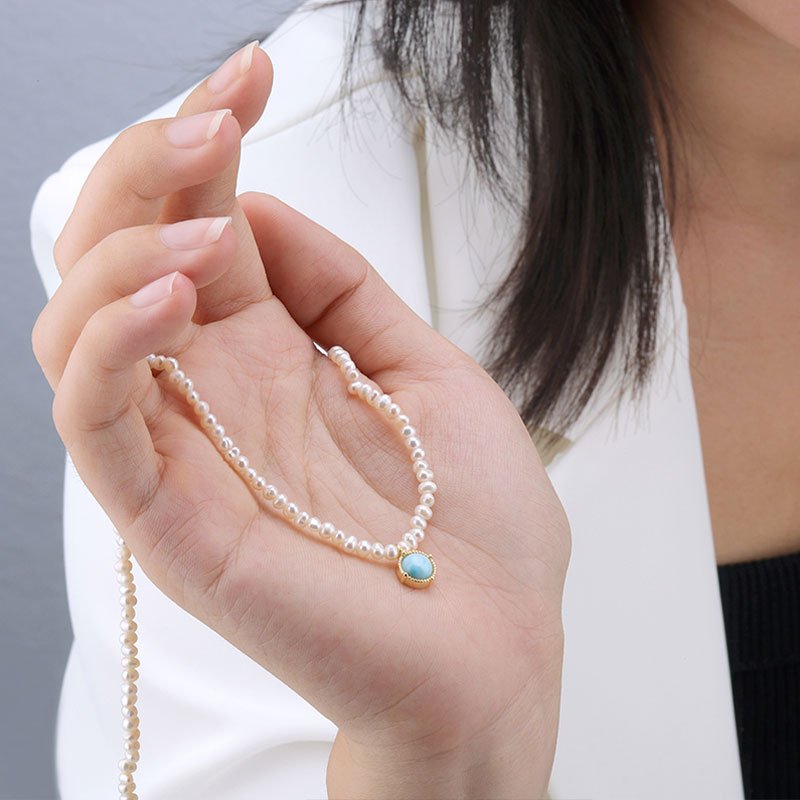 A timeless strand of luminous freshwater pearls accented with a serene larimar stone centerpiece. This necklace blends classic elegance with a soft pop of ocean-blue color, finished in warm gold over sterling silver for a refined, modern statement.