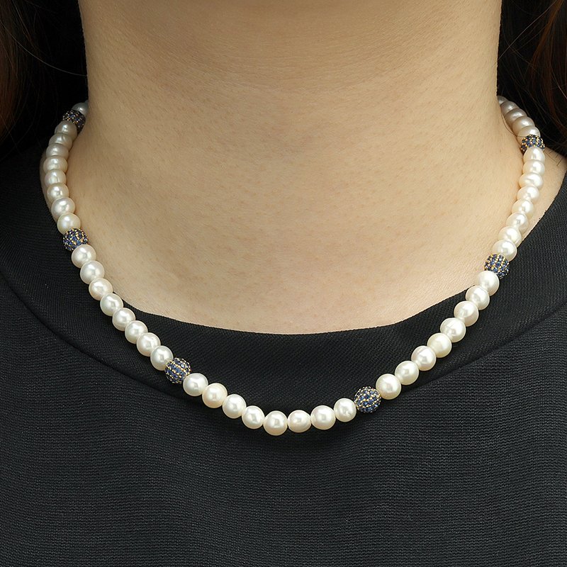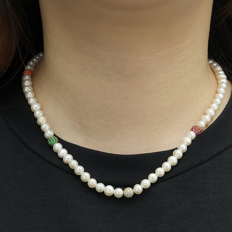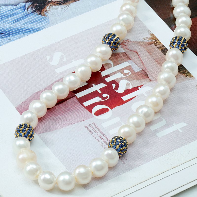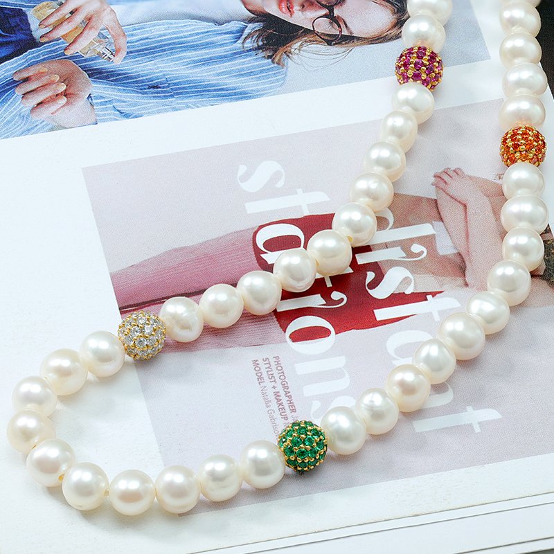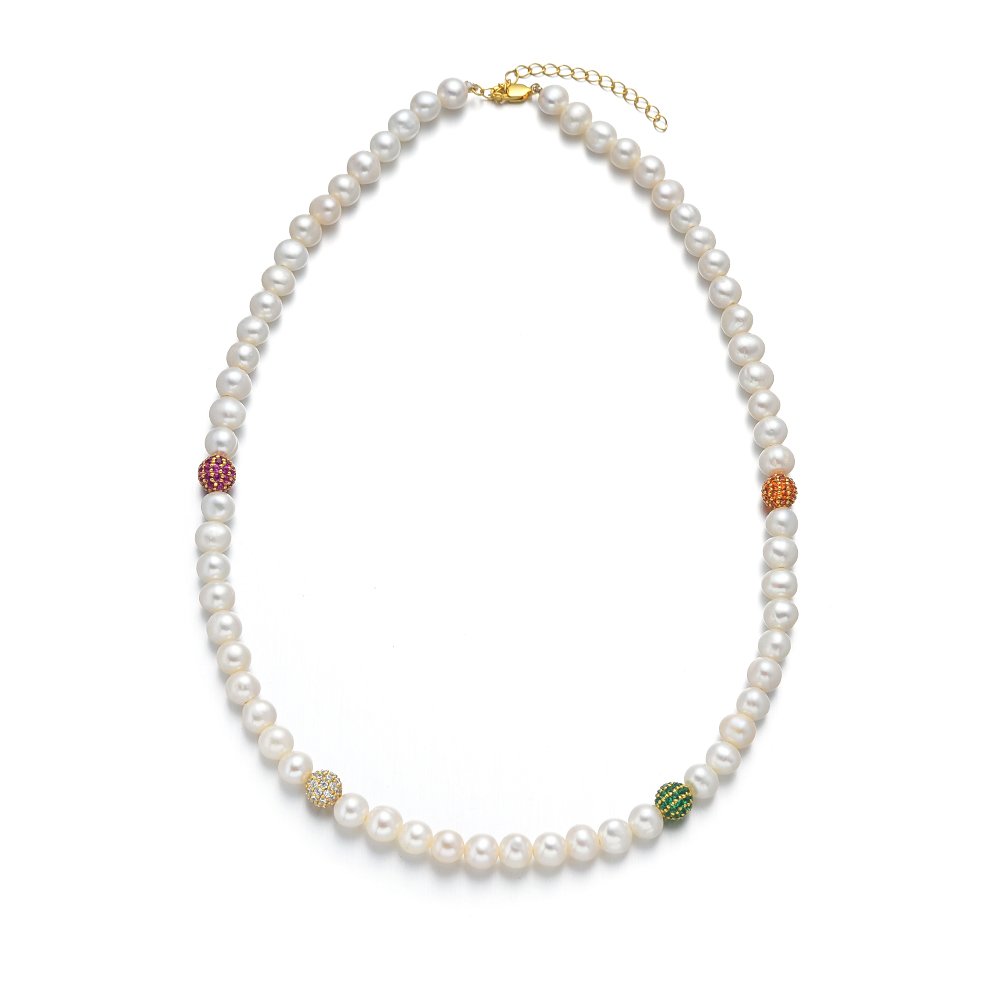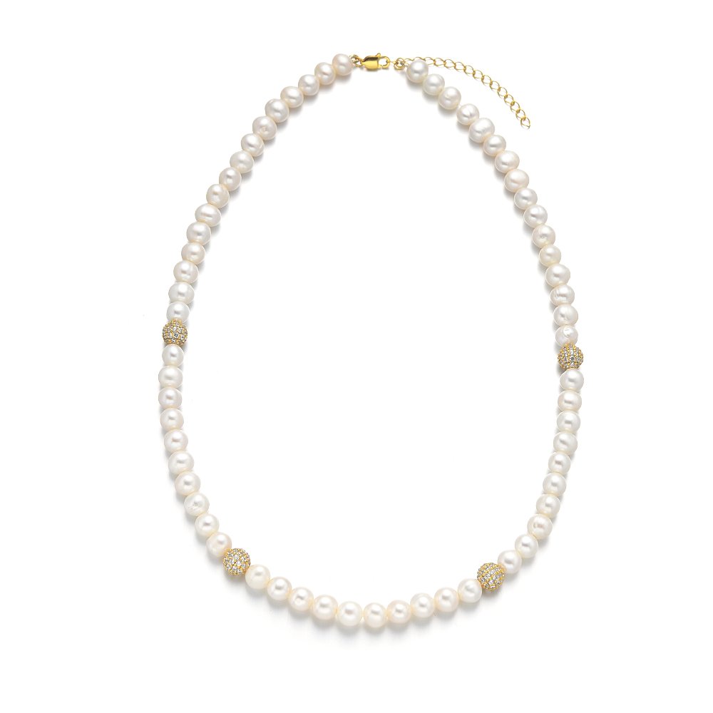 This refined freshwater pearl necklace blends classic elegance with contemporary brilliance. Hand-strung with luminous pearls and accented by pavé-set zircon “ice out” ball stations, the design delivers a sophisticated balance of tradition and modern luxury. Crafted in gold-plated sterling silver, this piece elevates both casual and formal styling with understated confidence.