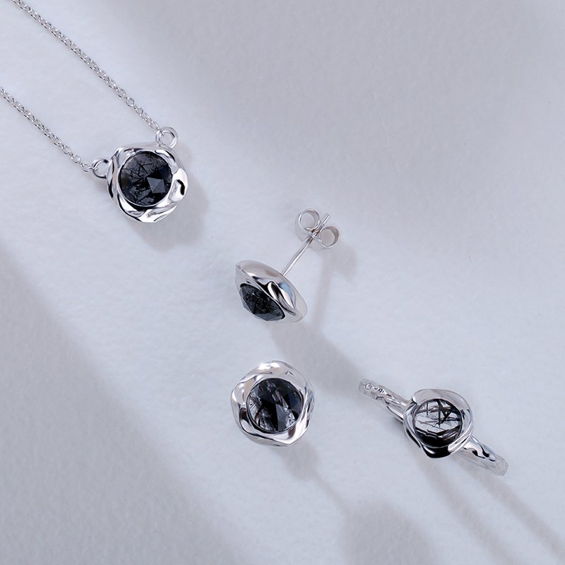 • Features a rose-cut round black rutilated quartz with distinctive natural inclusions