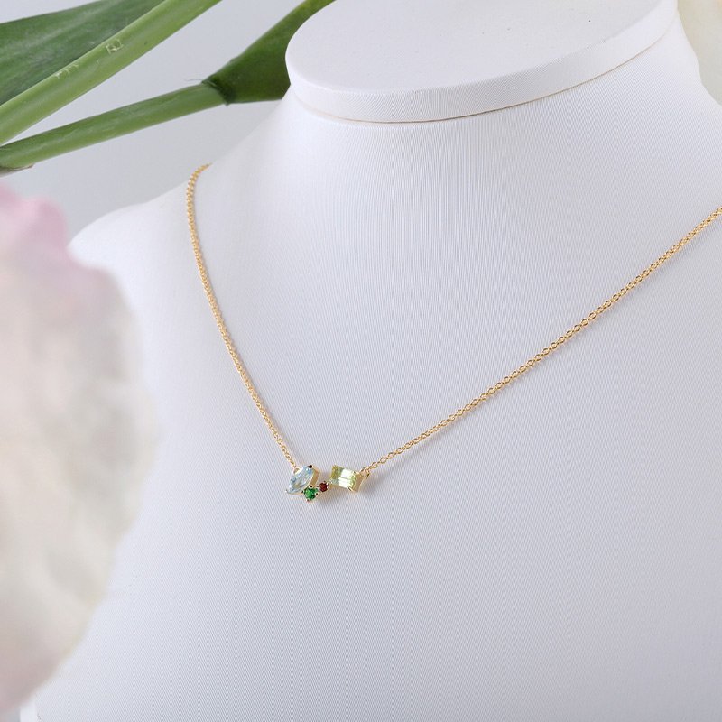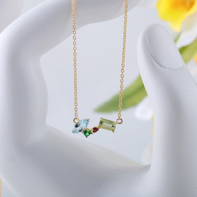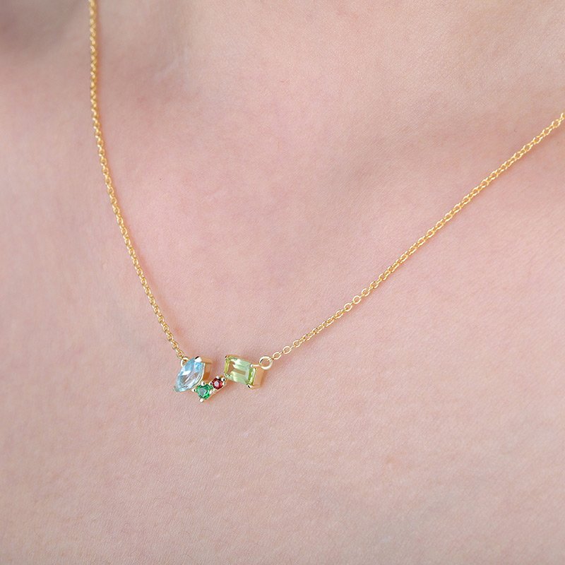 Delicate and luminous, this refined pendant necklace features a graceful arrangement of marquise and octagon-cut stones in fresh sky-blue and green tones. Crafted in sterling silver and finished with warm 14K gold plating, it offers a modern, airy elegance with subtle color contrast.