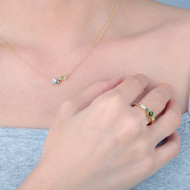| Stone Details | 5×3 mm Octagon Peridot (1 pc), 5×2.5 mm Marquise Sky Blue Crystal (1 pc), 1.5 mm Round Garnet (1 pc) |