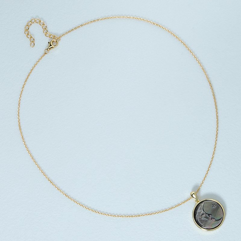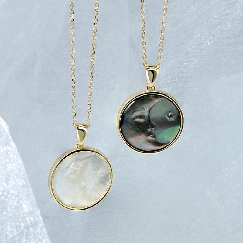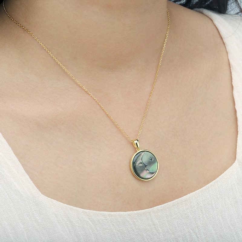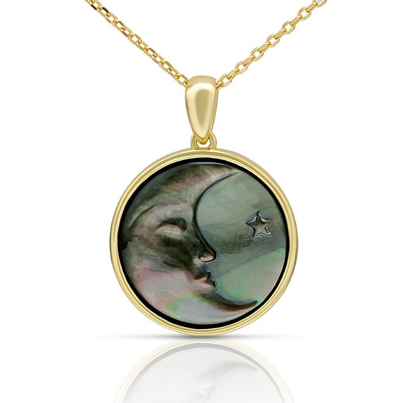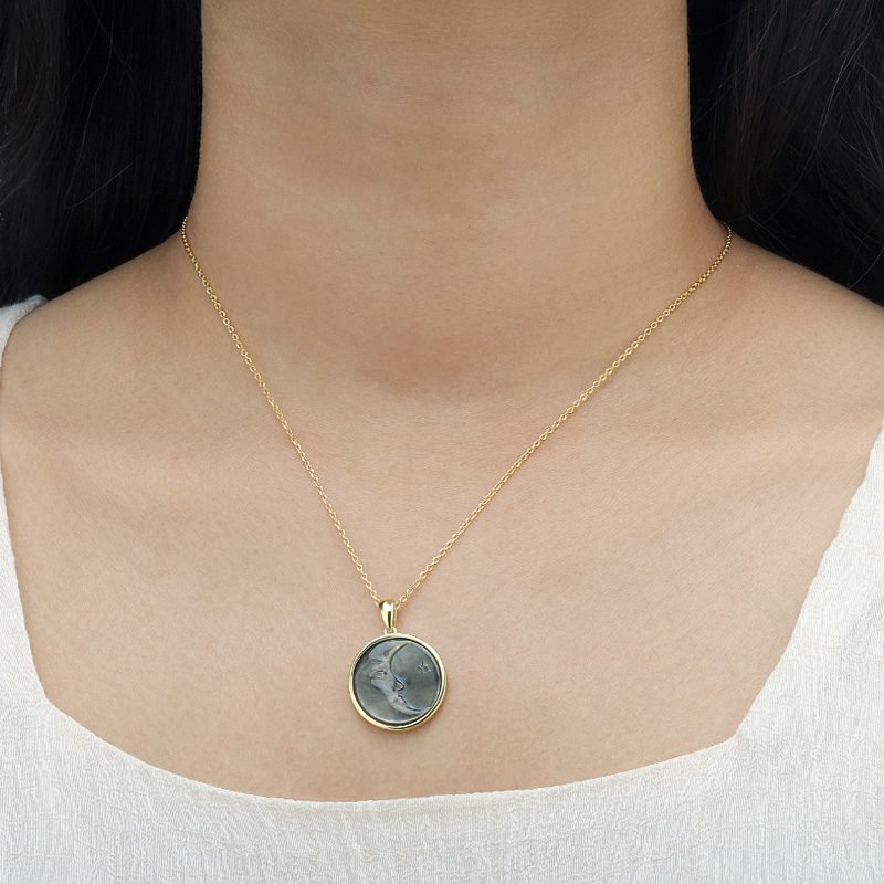 A striking expression of contrast and celestial beauty, this moon-inspired pendant features a carved black shell with natural iridescence set in a refined circular frame. The deep, shifting tones and sculptural motif create an elegant statement piece that feels bold, mysterious, and timeless.