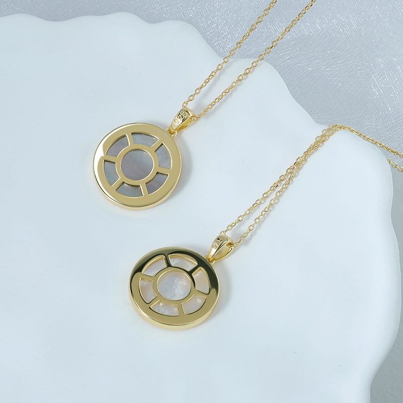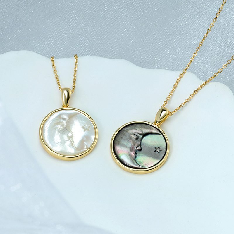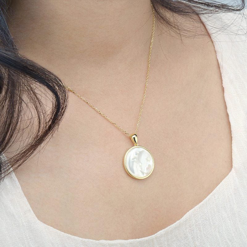 A poetic expression of light and form, this moon-inspired pendant features a delicately carved white shell set within a refined circular frame. The soft iridescence and celestial motif create an elegant statement piece that feels timeless, serene, and quietly captivating.