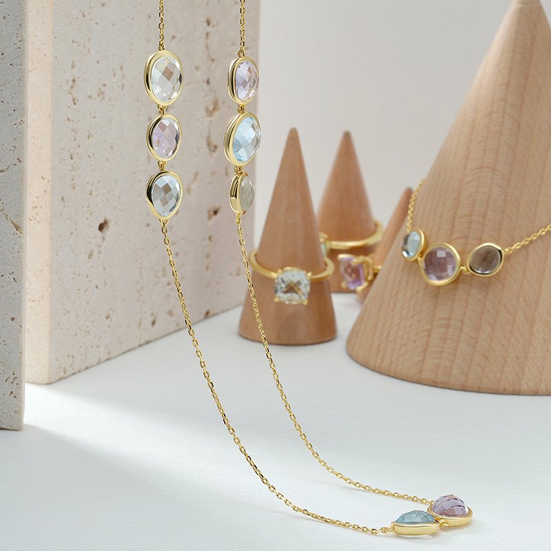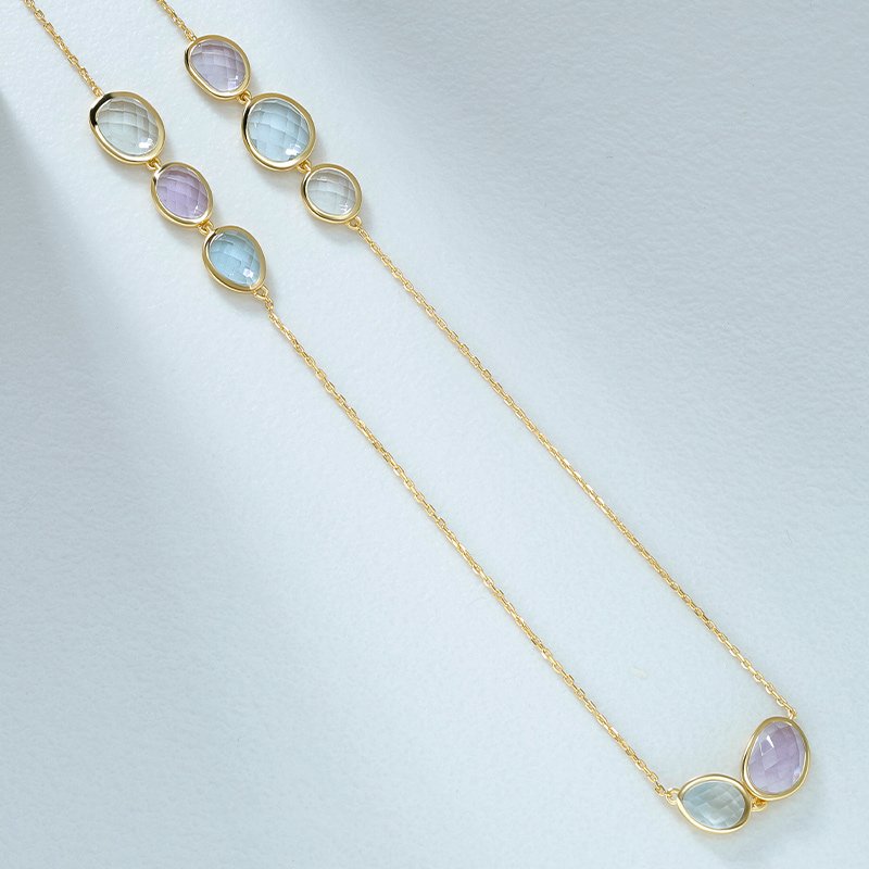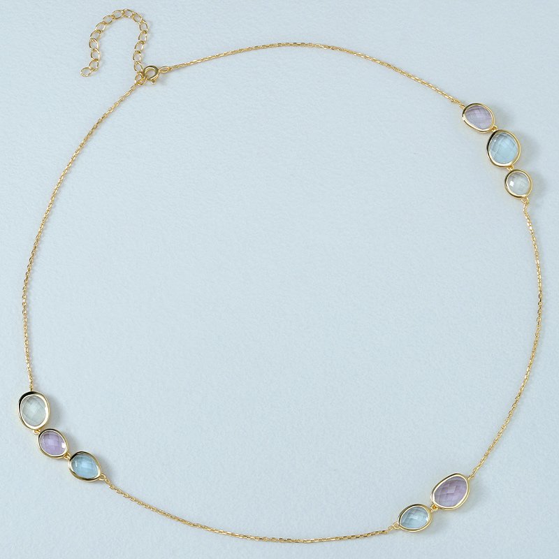 A refined multi-gem necklace designed to showcase soft color contrast and elegant balance. Crafted from genuine 925 sterling silver and finished with rich 18K gold plating, this piece features a harmonious arrangement of bezel-set gemstones for a polished yet playful look that transitions effortlessly from day to evening.
