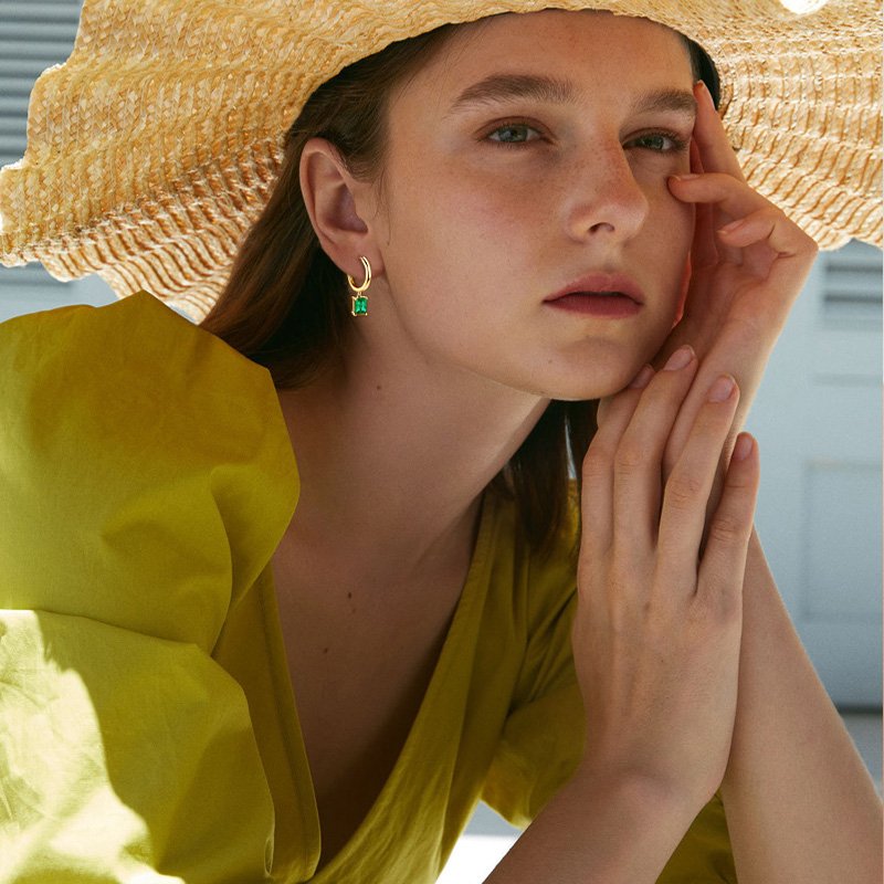 The Octagon Emerald Drop Earrings present a refined, architectural silhouette defined by a clean octagon-cut emerald suspended from a polished hoop. Crafted in 925 sterling silver and finished with radiant 14K gold plating, this design balances sharp geometry with elegant movement, delivering a modern yet timeless statement.