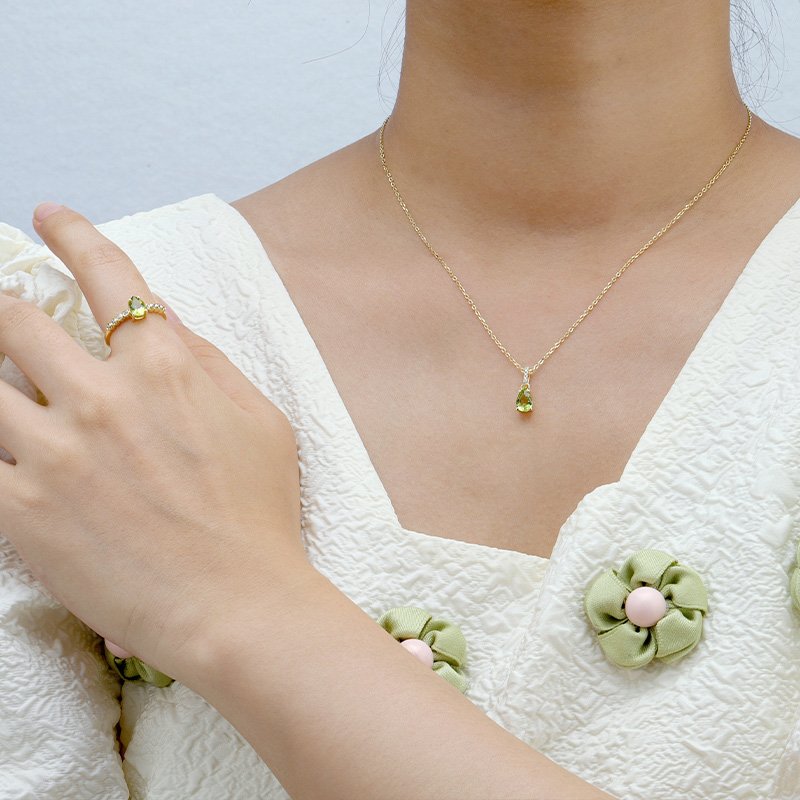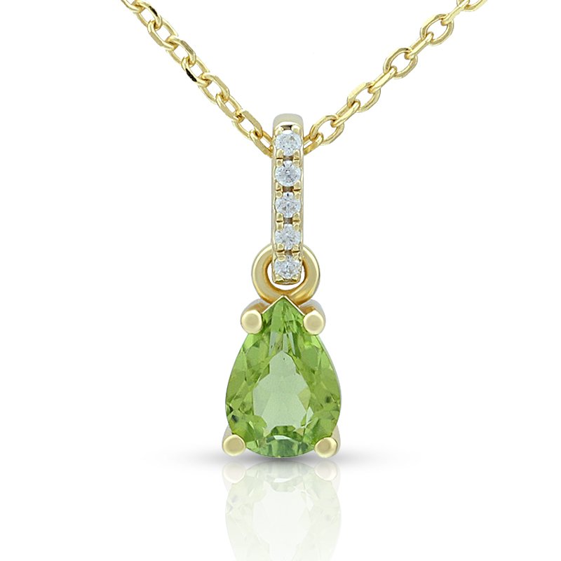 A graceful design defined by clarity and proportion. This pear-shaped peridot pendant showcases a fresh, vivid green hue, suspended beneath a refined vertical accent that adds balance and brilliance. Elegant and understated, it is designed to highlight the stone while offering effortless everyday wear.