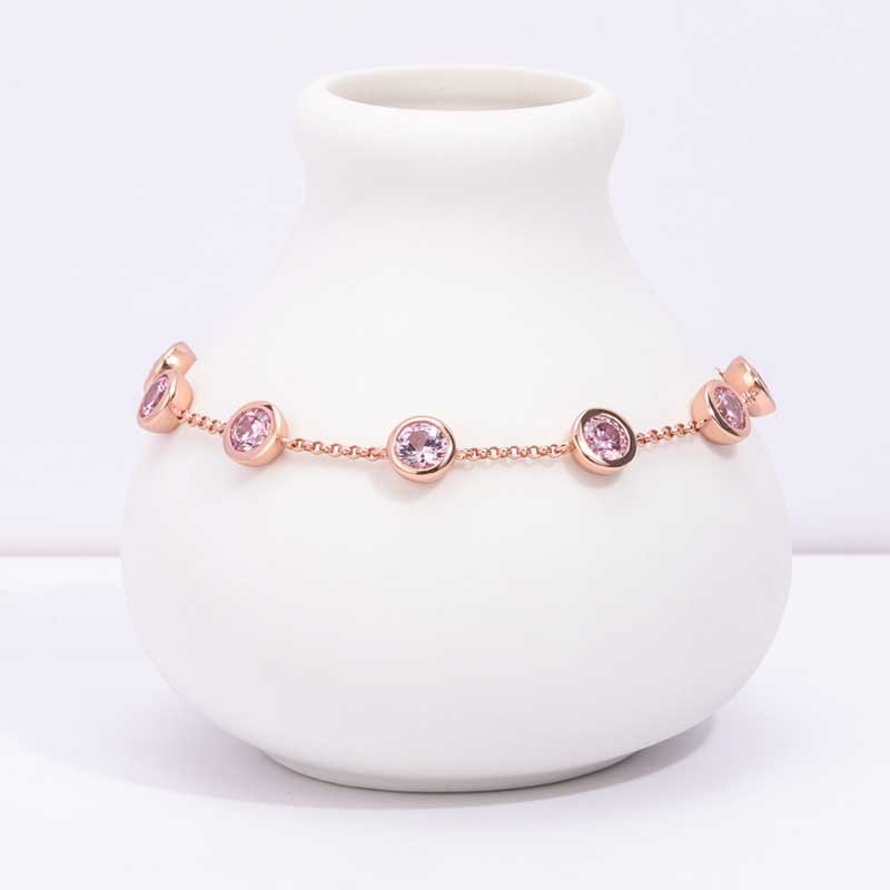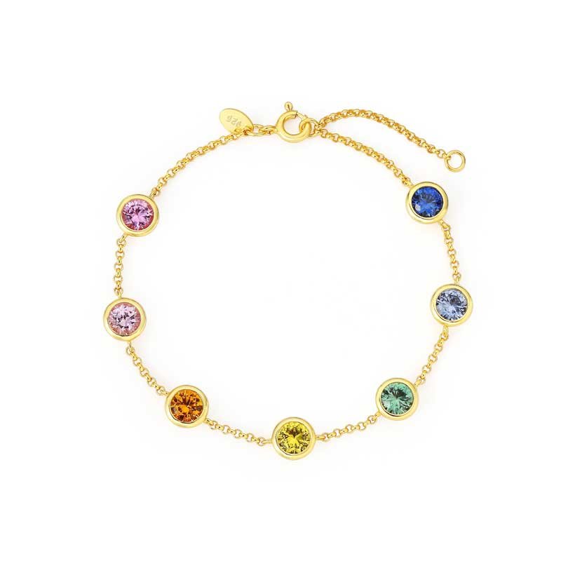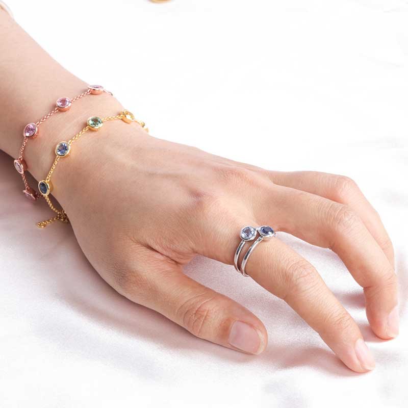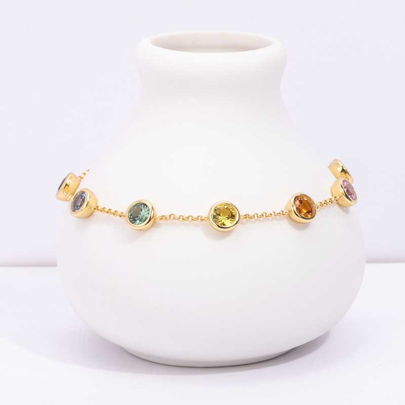 A vibrant yet refined chain bracelet featuring bezel-set corundum stones that create a graceful rainbow effect along the wrist. Designed to balance color, elegance, and everyday wearability, this piece adds a subtle statement whether worn alone or layered with other bracelets.