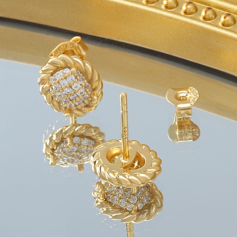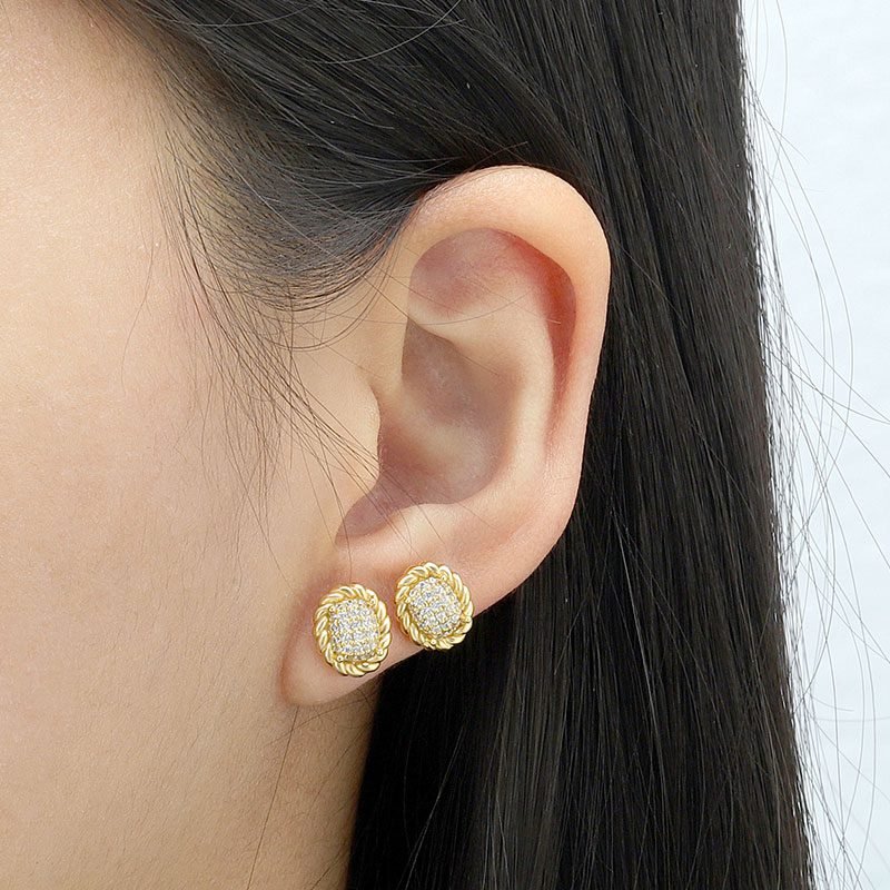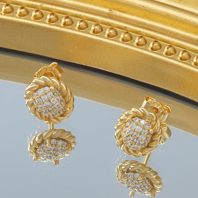 Inspired by vintage geometry and classic gold textures, the Retro Geometrical Stars Flower Round Earrings bring sculptural elegance to a timeless stud silhouette. Crafted from solid 925 sterling silver and finished in rich 18K yellow gold plating, each earring features a rope-textured floral frame surrounding a brilliant pavé of white cubic zirconia. The result is a refined statement piece that balances retro character with modern polish.
