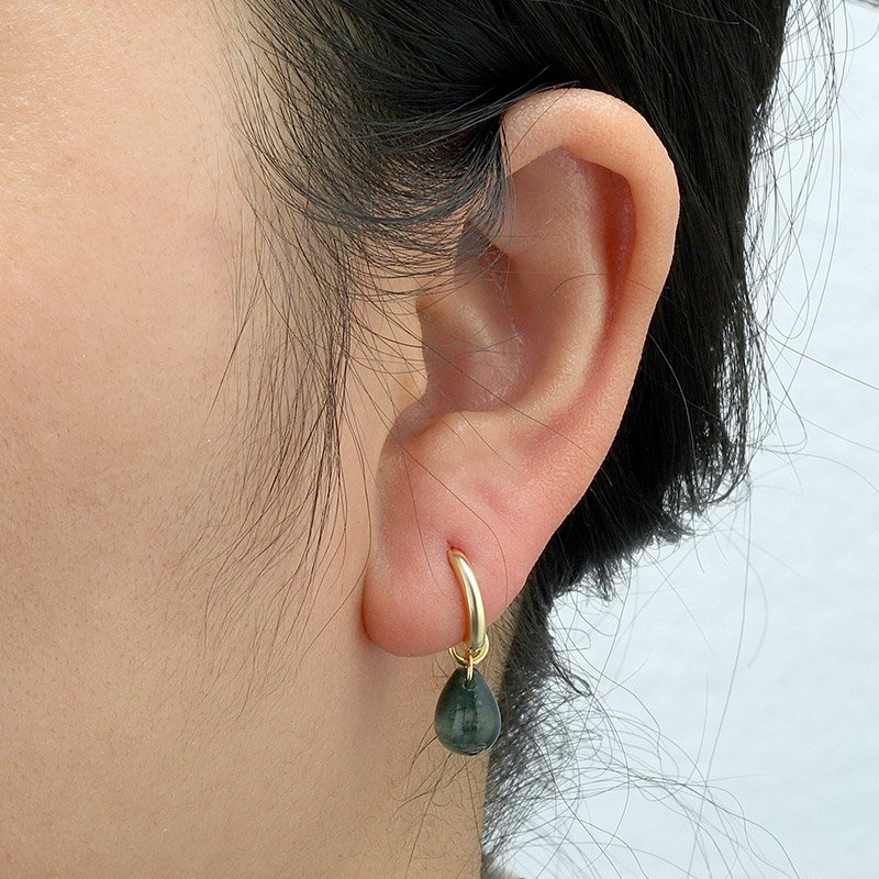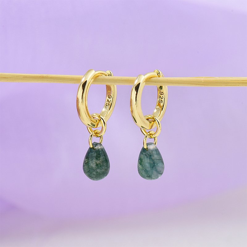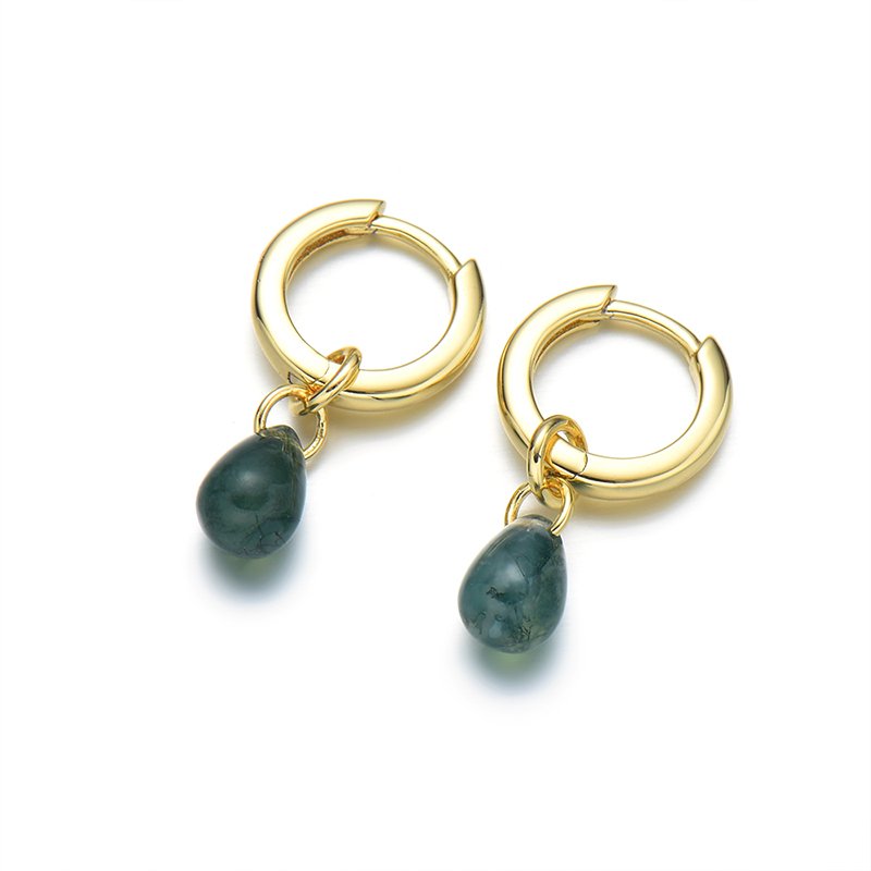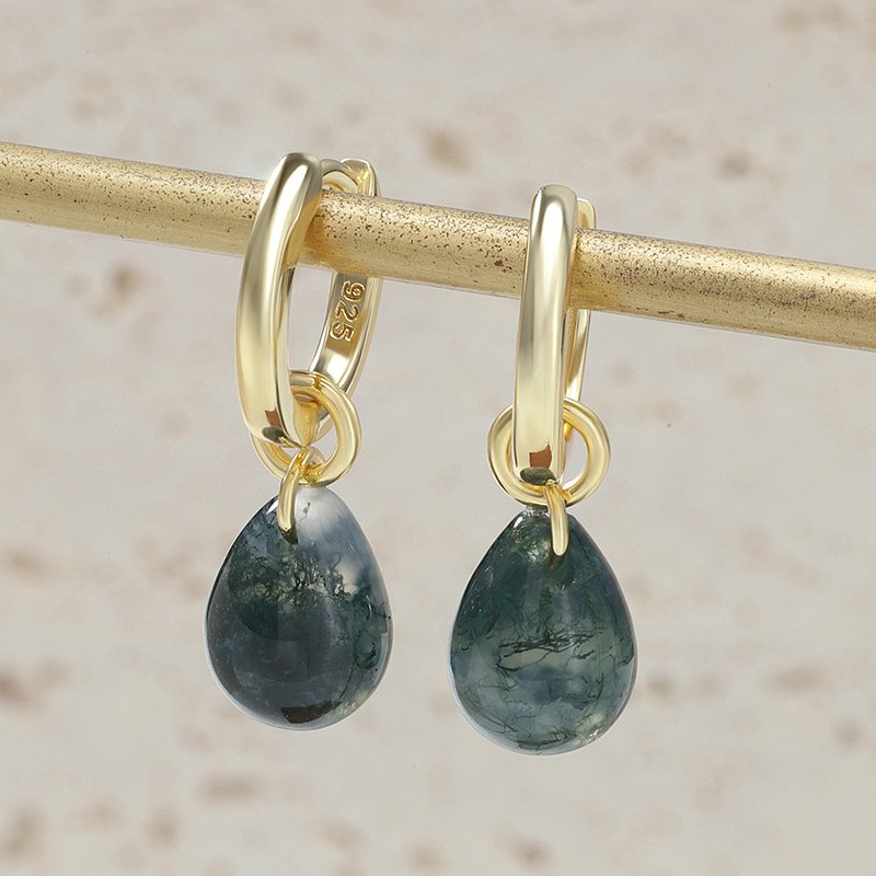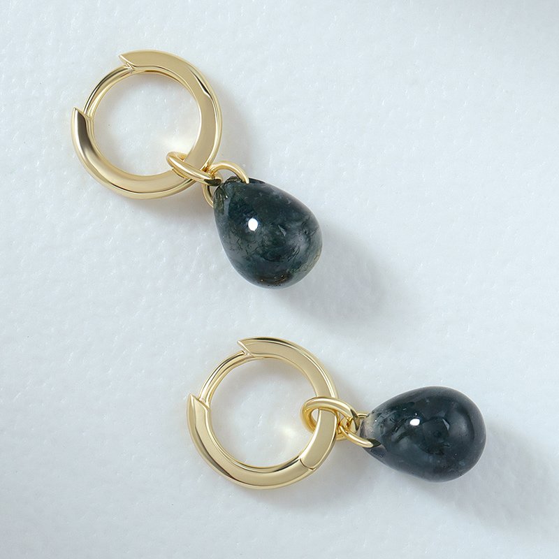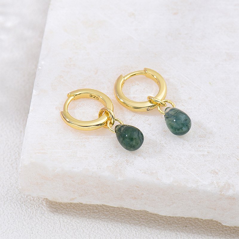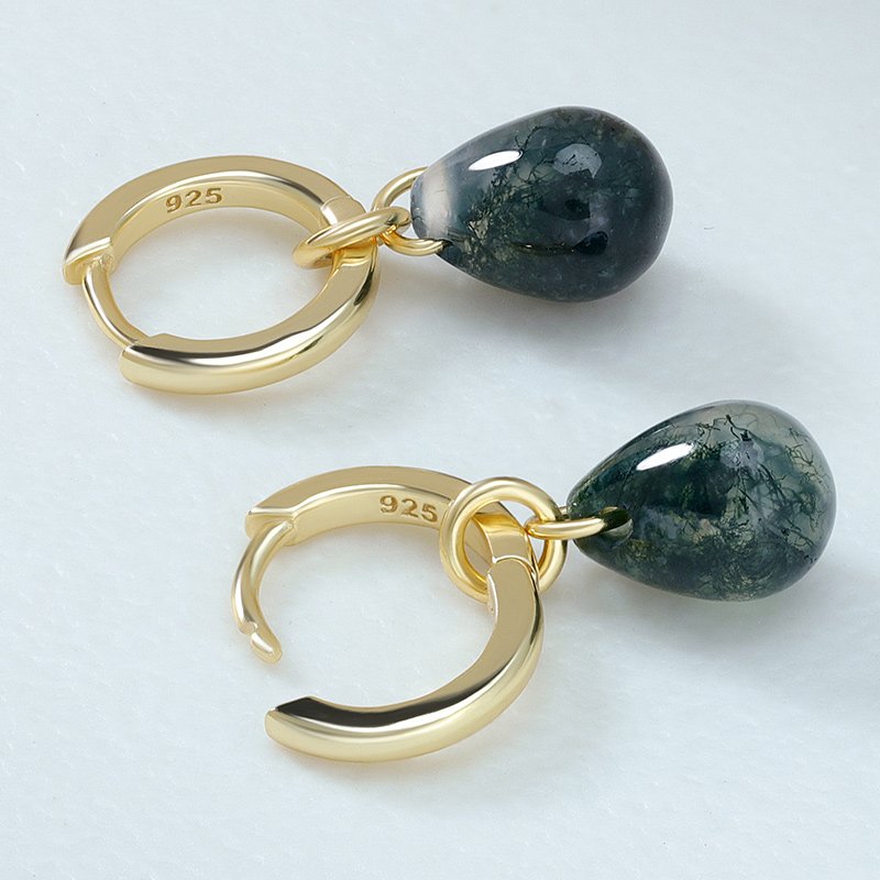 The Retro Moss Agate Earrings feature a refined hoop silhouette accented with a natural moss agate teardrop charm. Crafted in sterling silver and finished with warm gold plating, this design balances vintage inspiration with modern minimalism, offering subtle movement and organic depth for everyday elegance.
