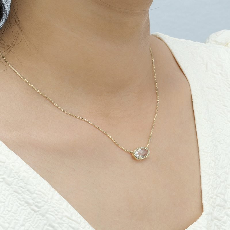 A refined statement of light and form, this oval rock crystal necklace features a faceted clear stone set within a delicately textured bezel. The result is a luminous pendant that captures and reflects light with understated elegance, offering a timeless piece designed for everyday sophistication.