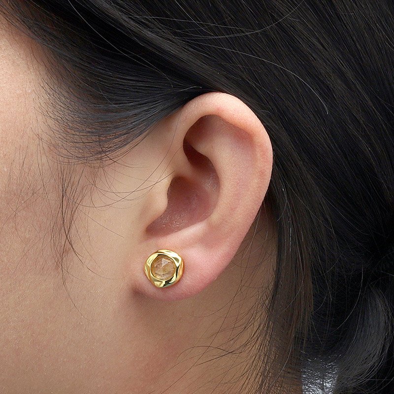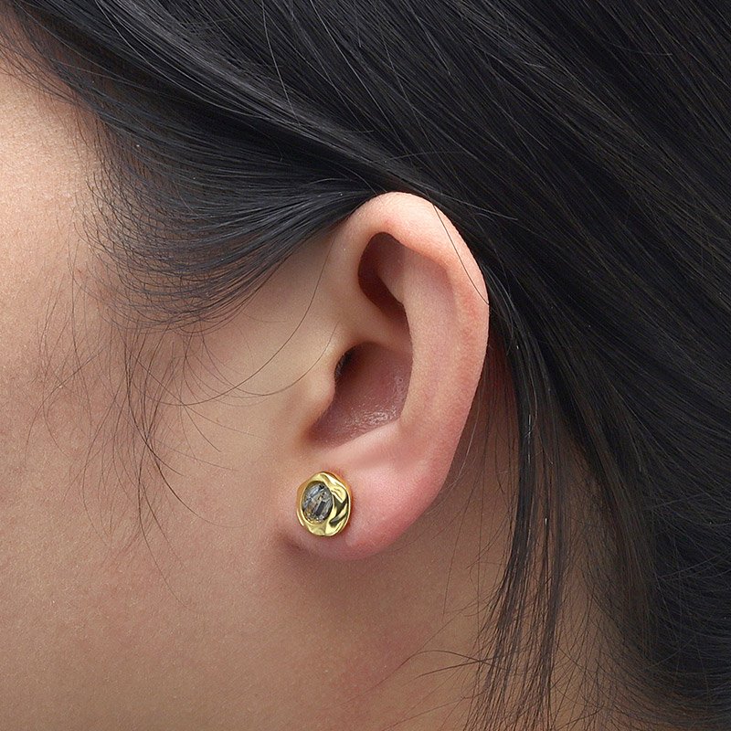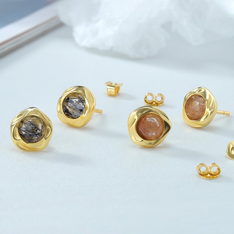 Sculptural and refined, the Round Black Rutilated Quartz Earrings showcase the natural beauty of faceted rutilated quartz framed by an organic, molten-style setting. Crafted from solid 925 sterling silver and finished in rich gold plating, each stud highlights the unique black needle inclusions that make rutilated quartz so distinctive. No two stones are exactly alike, giving every pair an individual character.