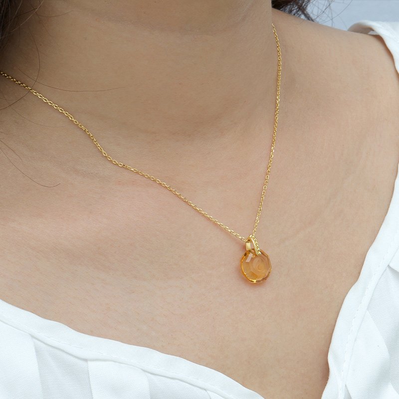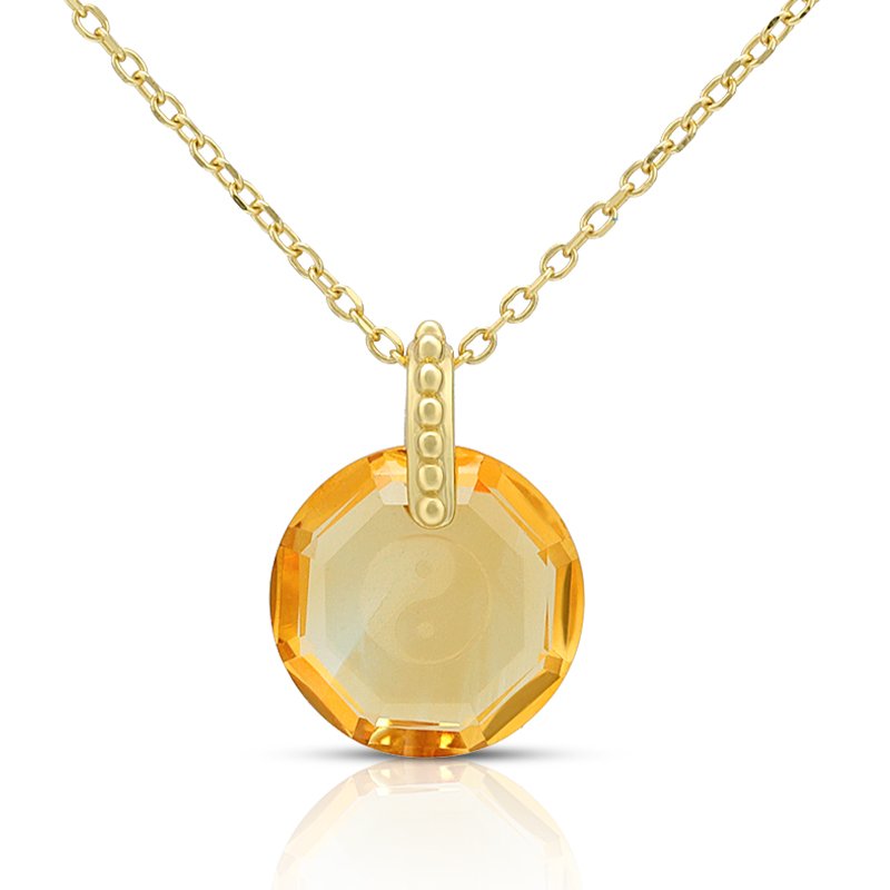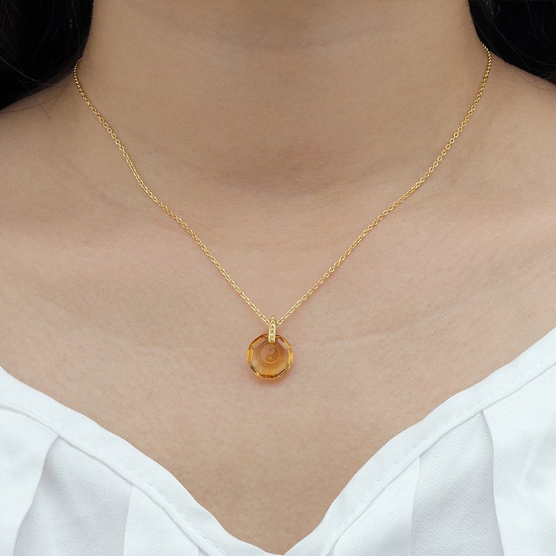 A modern pendant necklace featuring a faceted round citrine crystal with a subtle engraved center motif. Finished in a polished gold-tone setting, this design emphasizes clarity, symmetry, and refined craftsmanship for versatile everyday wear.