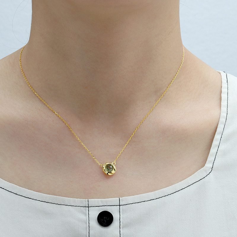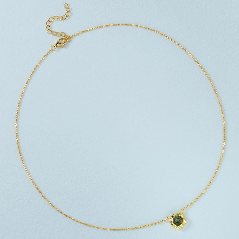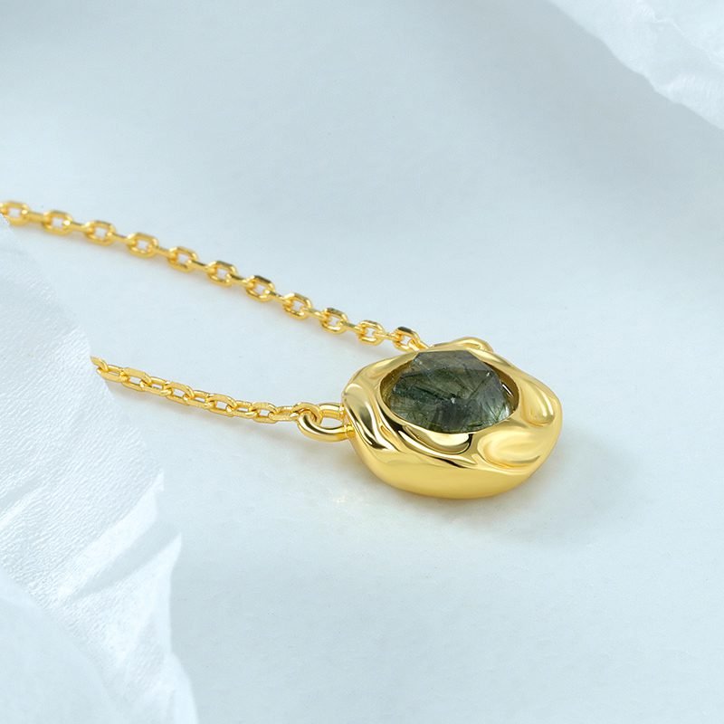 An elegant study in natural texture and refined form. This round green rutilated quartz necklace features a faceted gemstone framed in an organic, softly sculpted bezel. Each stone reveals distinctive internal inclusions, making every piece subtly unique while maintaining a timeless, elevated look.