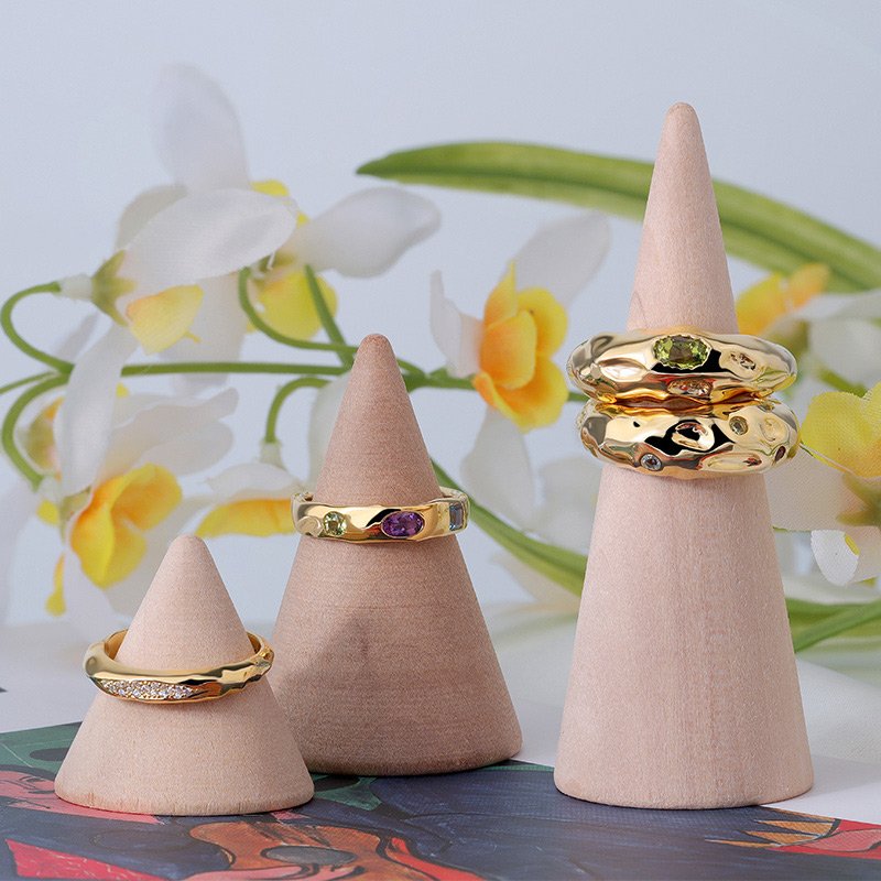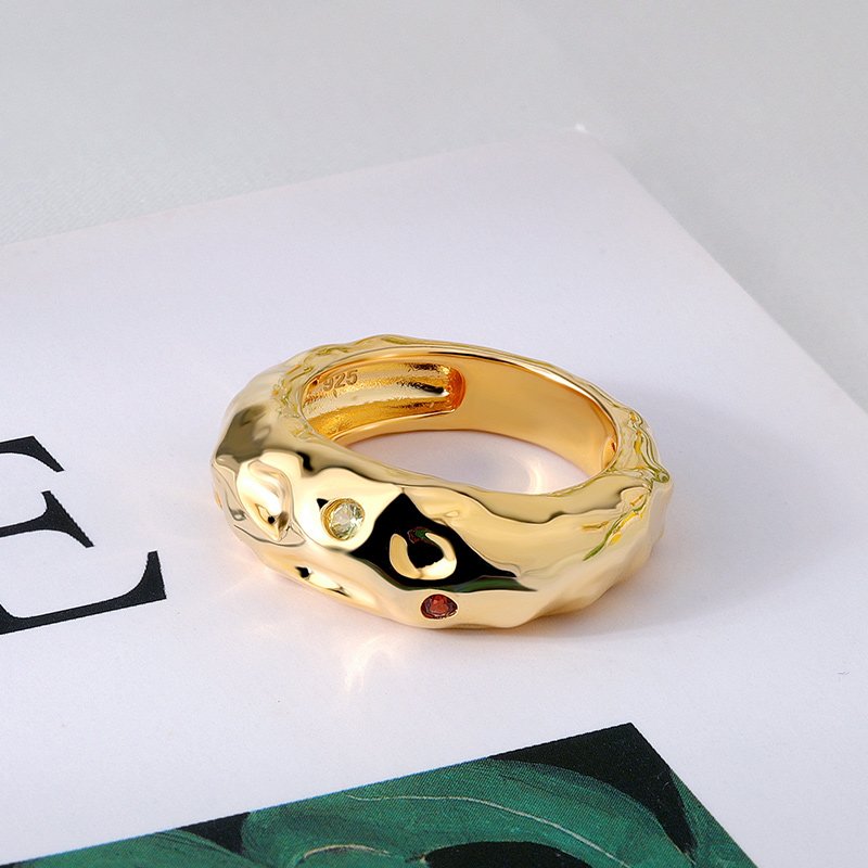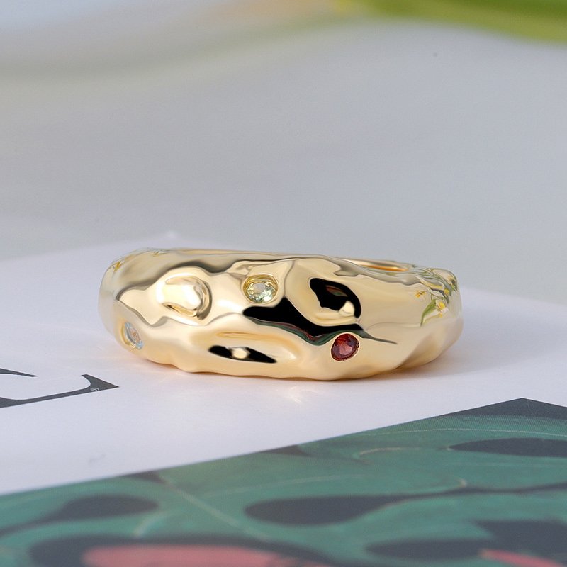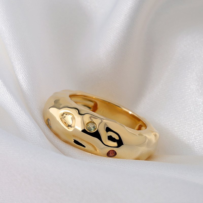A bold sculptural ring designed to make a statement through texture and color. Featuring an organic gold-tone band accented with vibrant gemstones, this piece blends artistic form with refined craftsmanship for a distinctive, modern look.