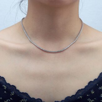 A timeless essential with a clean, high-shine finish. This 2mm tennis necklace features a continuous line of cubic zirconia in a refined micro setting, crafted from 925 sterling silver and finished in a bright white gold–tone plating. Designed to wear beautifully on its own or layered for a more elevated look. ABOUT THIS ITEM Classic…