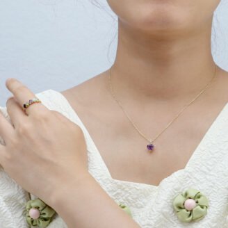 A refined pendant necklace featuring a heart-shaped amethyst centerpiece, designed to express elegance, warmth, and emotional meaning. Its romantic silhouette and rich violet tone make it a timeless piece for everyday wear or heartfelt gifting. ABOUT THIS ITEM Heart-shaped amethyst gemstone with faceted brilliance Romantic pendant design with clear accent stones Classic birthstone style with…