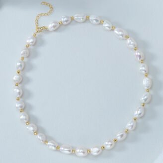 A refined choker necklace crafted in 925 sterling silver with 18K gold plating, featuring naturally shaped baroque pearls. Each pearl offers organic character and subtle luster, creating a timeless statement that balances elegance with modern sophistication. Designed to sit gracefully along the neckline, this piece transitions effortlessly from everyday refinement to elevated occasions. ABOUT THIS…