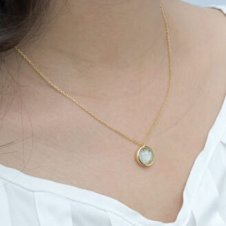 $99 Original price was: $99.$59.40Current price is: $59.40.A refined pendant necklace showcasing a Japanese Kiriko–inspired green amethyst, cut to capture light with subtle texture and depth. The circular silhouette and soft green hue deliver understated elegance, blending artisanal character with modern minimalism. ABOUT THIS ITEM Japanese Kiriko–style green amethyst centerpiece Circular pendant with delicately textured stone surface Soft green tone with refined…