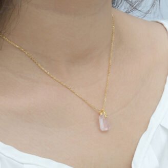 $99 Original price was: $99.$59.40Current price is: $59.40.A refined pendant necklace featuring an octagon-cut rose quartz crystal with a minimalist engraved heart detail. Designed with crisp geometry and a polished gold-tone finish, this piece delivers a contemporary aesthetic suitable for everyday wear or elevated layering. ABOUT THIS ITEM Precision-cut octagon rose quartz crystal Subtle engraved heart detail integrated into the stone surface…