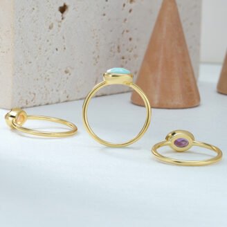 A refined oval gemstone ring designed with a smooth, minimalist silhouette that highlights natural color and soft luminosity. Crafted in sterling silver with a polished gold finish, this piece is ideal for everyday wear or elegant stacking, offering subtle character through carefully selected gemstones. ABOUT THIS ITEM Oval-cut gemstone with a smooth, softly faceted surface…