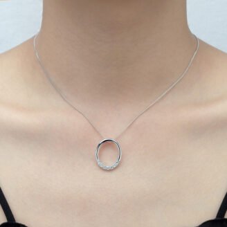 Clean and balanced in form, this oval open pendant necklace features a smooth sculptural silhouette accented with subtle cubic zirconia along the base. Crafted from genuine 925 sterling silver and finished in 14K white gold plating, it delivers refined simplicity designed for effortless everyday wear. ABOUT THIS ITEM Elegant open oval pendant with a modern…