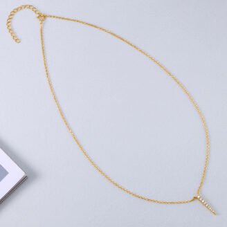 A sharp, minimalist silhouette designed for modern elegance, this cubic zirconia spike necklace delivers refined edge with a sleek vertical drop. Precisely set stones add controlled brilliance, making it a confident statement piece that transitions seamlessly from day to night. About This Item Crafted from solid 925 sterling silver Finished with 18K yellow gold plating…