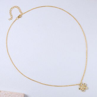 A refined floral pendant designed to capture light with subtle brilliance, this cubic zirconia flower necklace offers timeless elegance with a modern finish. The balanced proportions and soft sparkle make it an effortless piece for daily wear or understated evening styling. About This Item Crafted from solid 925 sterling silver Finished with 18K yellow gold…