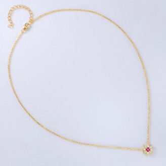 A timeless symbol rendered with refined brilliance. This eight-pointed star necklace centers a vivid created ruby, framed by diamond-like cubic zirconia accents that radiate balanced symmetry and quiet sophistication. Finished in warm gold over sterling silver, it is designed to feel elegant, meaningful, and enduring. About This Item Crafted from solid 925 sterling silver Finished…