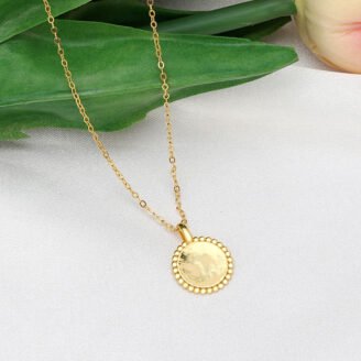 $79 Original price was: $79.$47.40Current price is: $47.40.A refined engraved disk necklace designed for understated elegance and personal expression. Featuring a softly hammered round pendant with a beaded edge, this piece offers a timeless silhouette that transitions effortlessly from everyday wear to meaningful gifting. Designed to support customization, it serves as a subtle statement with lasting significance. About This Item Classic round…